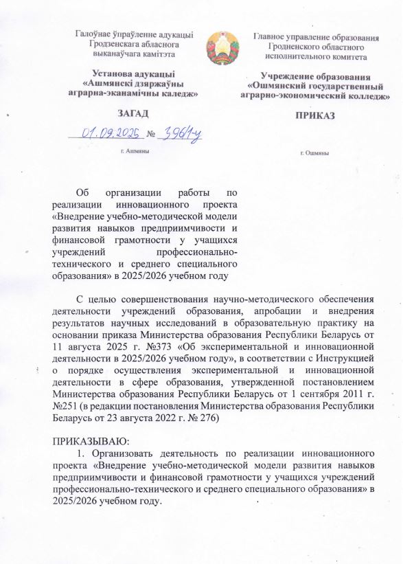 В 2025/2026 году на базе колледжа продолжается работа над инновационным проектом "Внедрение учебно-методической модели развития навыков предприимчивости и финансовой грамотности у учащихся учреждений образования, реализующих образовательные программы профессионально-технического и среднего специального образования". Директором колледжа утвержден приказ по реализации инновационной деятельности в учреждении образования на 2025/2026 учебный год.