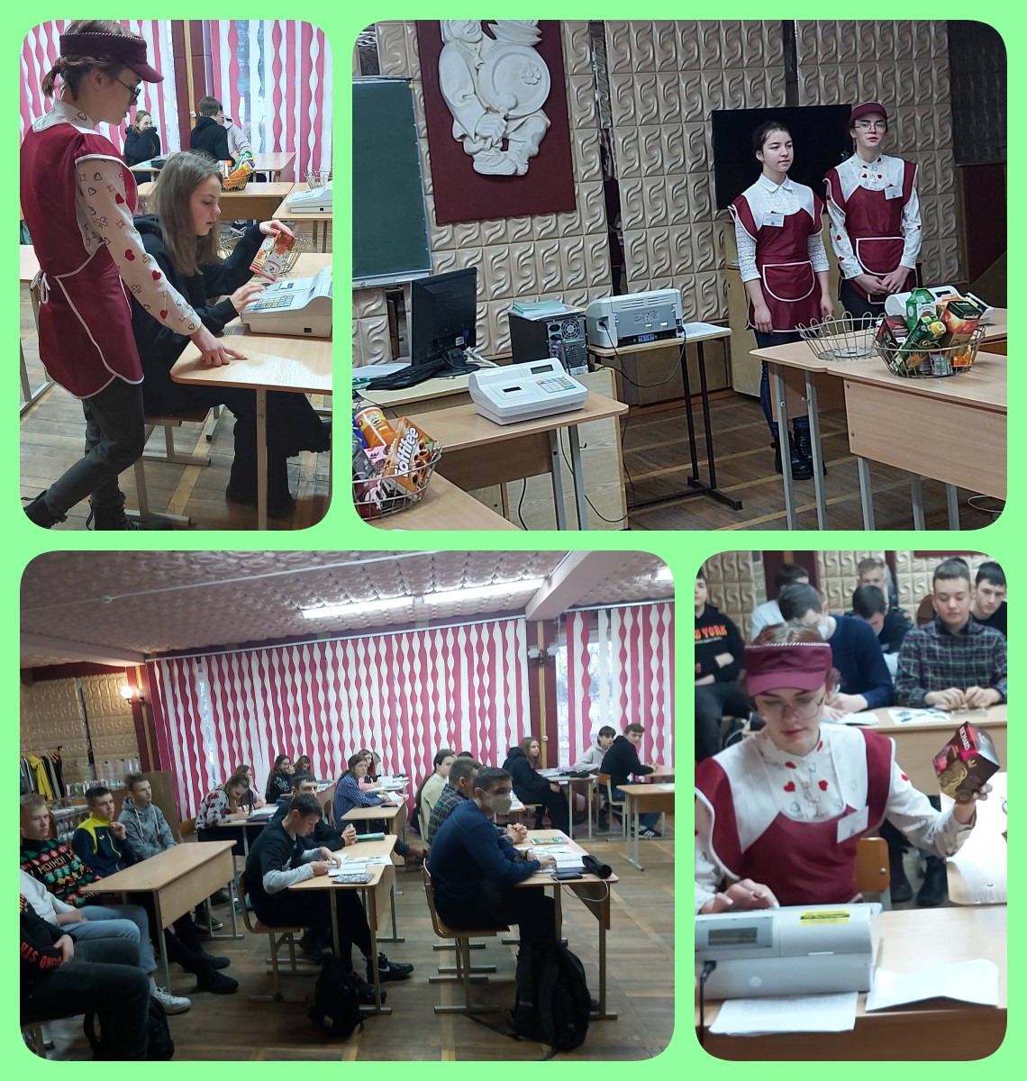 В минувшую субботу 18 декабря учащиеся группы 6пр представляли профессию «контролер-кассир». Девушки показали, как работают кассиры на контрольно-кассовом аппарате методом «двойная корзина». Другое название этого метода называется «из корзины в корзину». Ребята, для которых проходила данная демонстрация, также имели возможность поработать на кассовом аппарате. Учащиеся школ узнали, что продавец – это главное действующее лицо магазина, так как от его работы зависит мнение о магазине. Ведь задача продавца - встречать, обслуживать и провожать покупателя, безошибочно считать деньги и не забывать о культуре поведения.