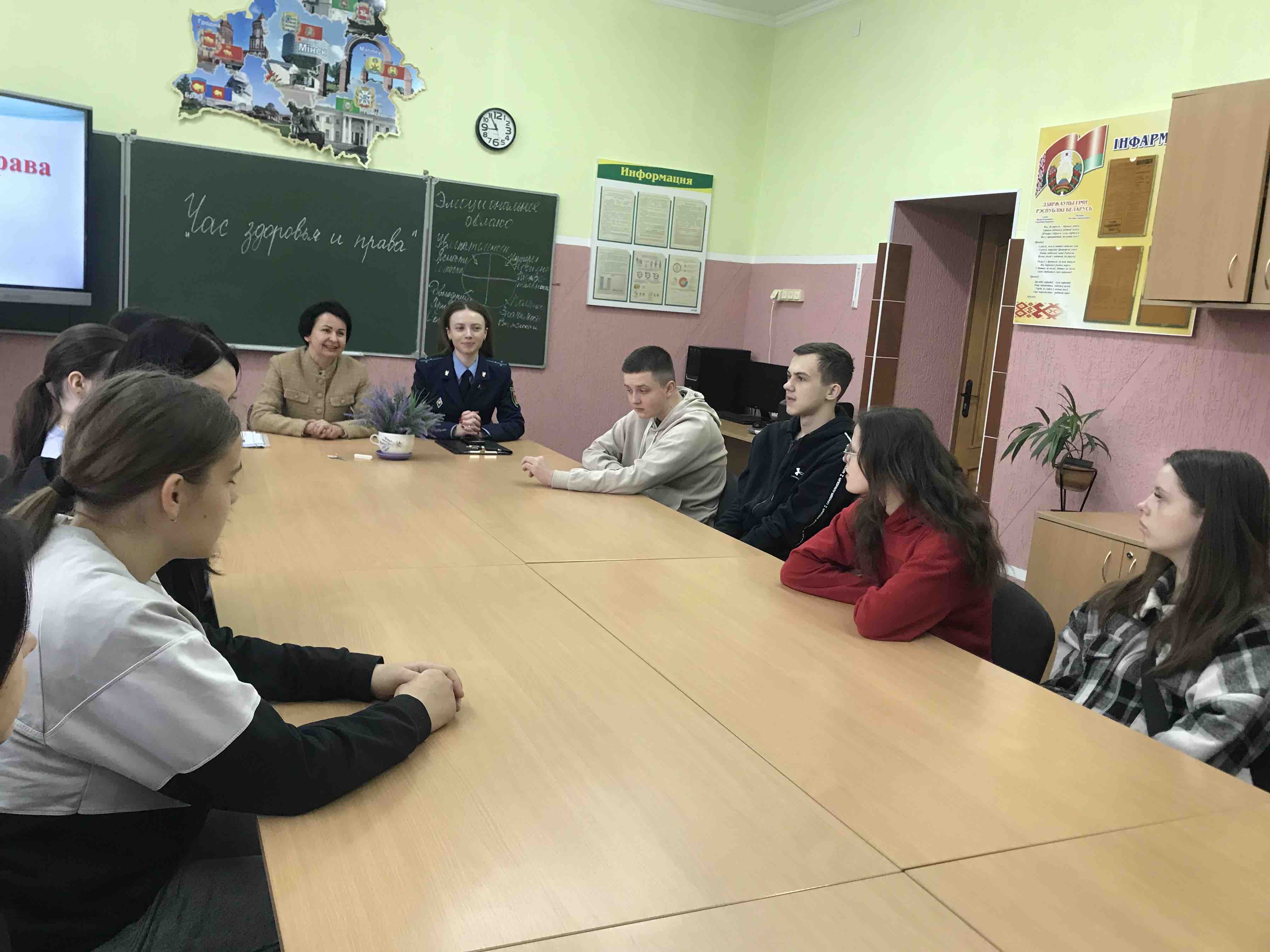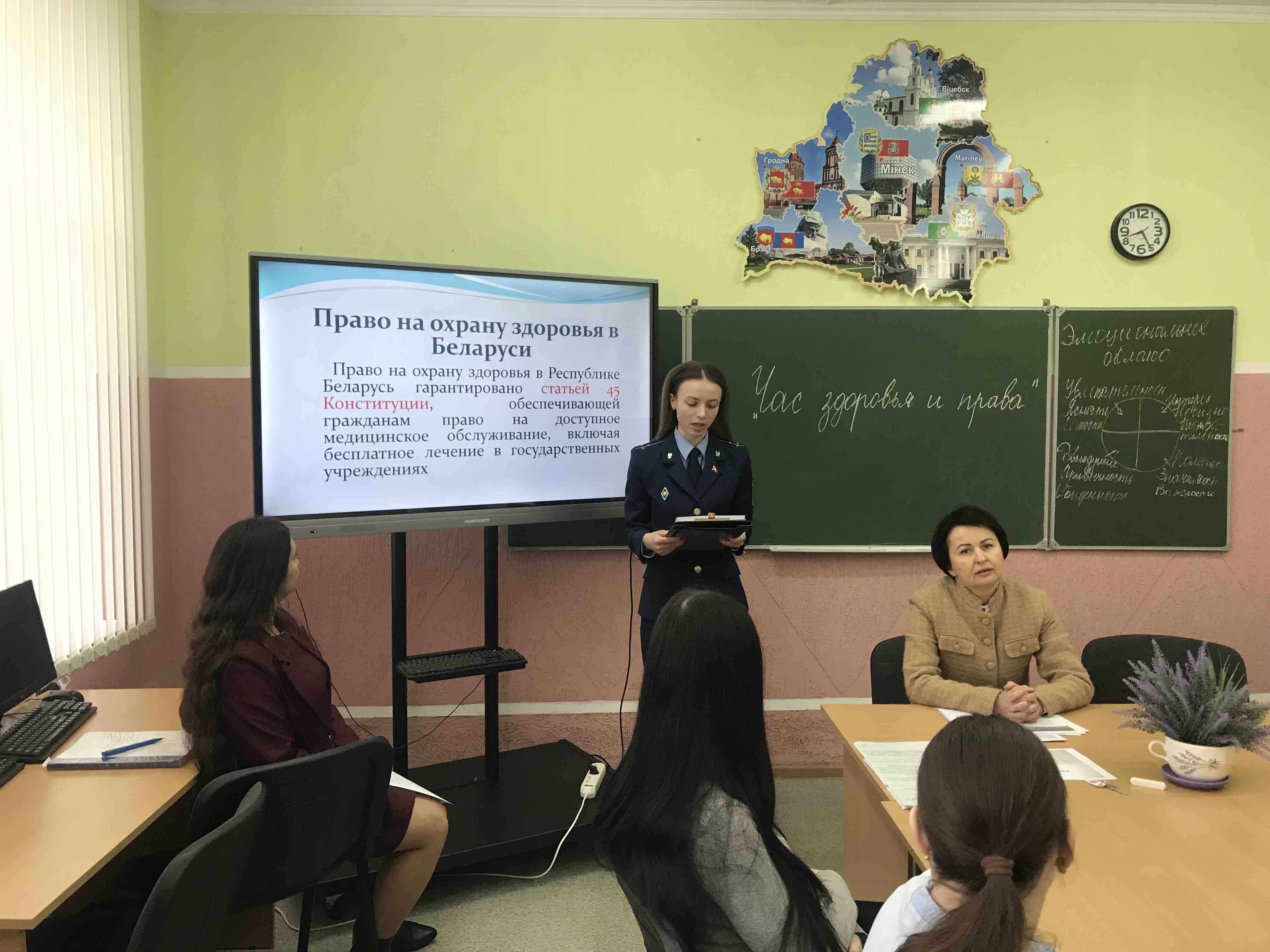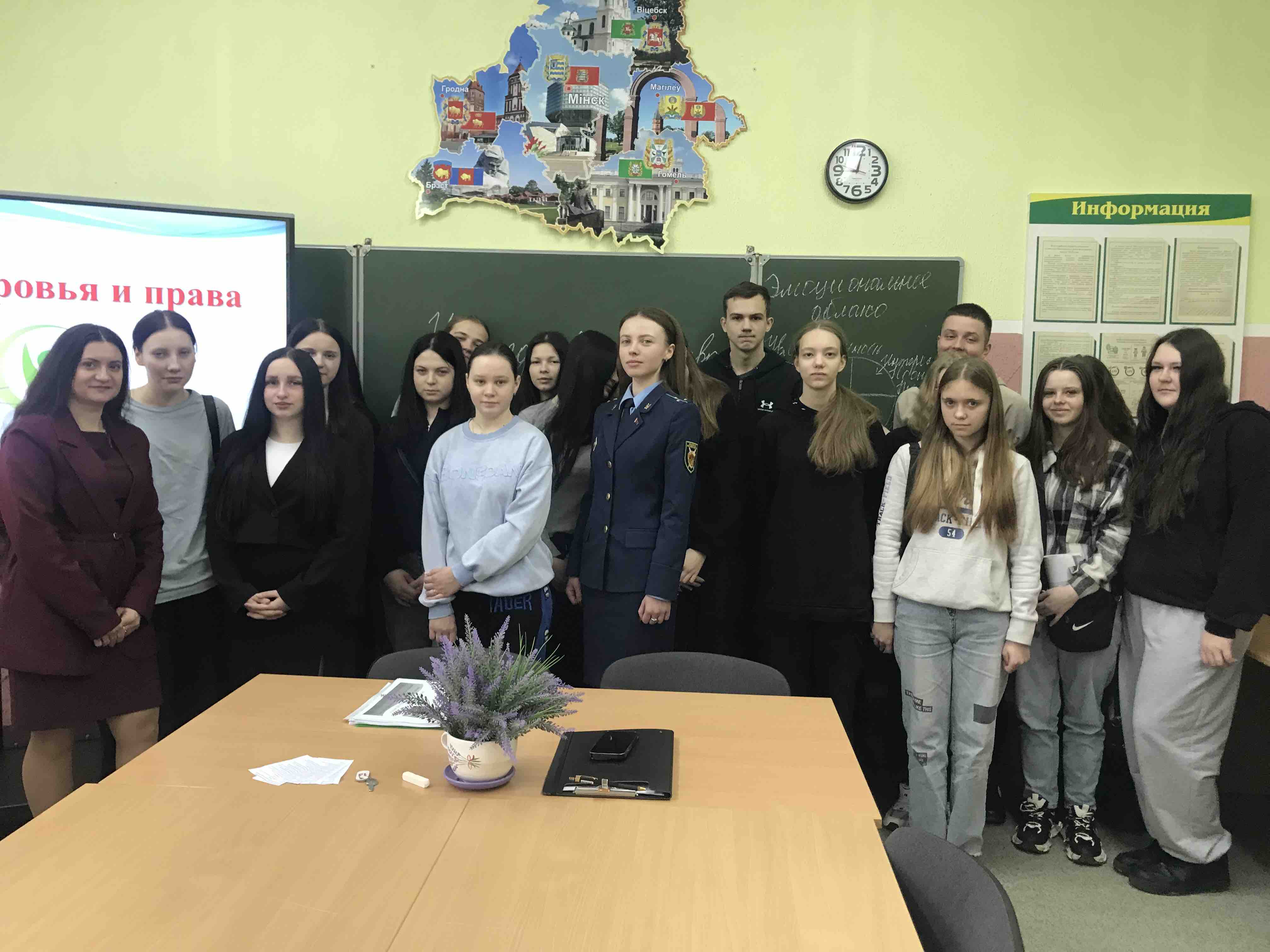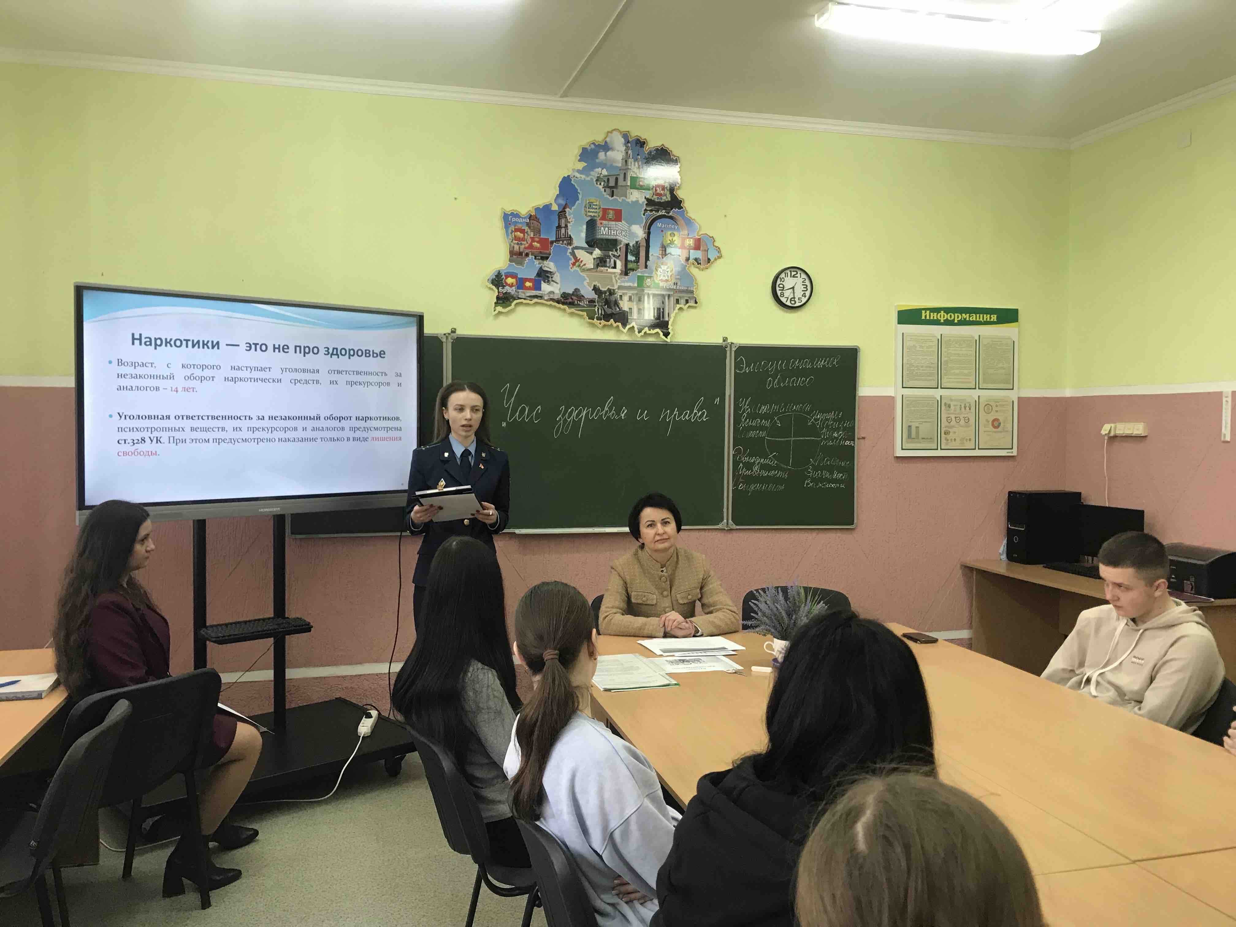 Выступление старшего помощника прокурора было посвящено правовым аспектам здоровья. Александра Сергеевна разъяснила учащимся конституционное право на охрану здоровья, гарантированное гражданам Республики Беларусь, а также акцентировала внимание на видах ответственности за причинение вреда здоровью. Отдельным блоком стала тема «Наркотики — это не про здоровье»: представитель прокуратуры предупредила о тяжелых правовых последствиях и необратимых изменениях в организме при употреблении психоактивных веществ.