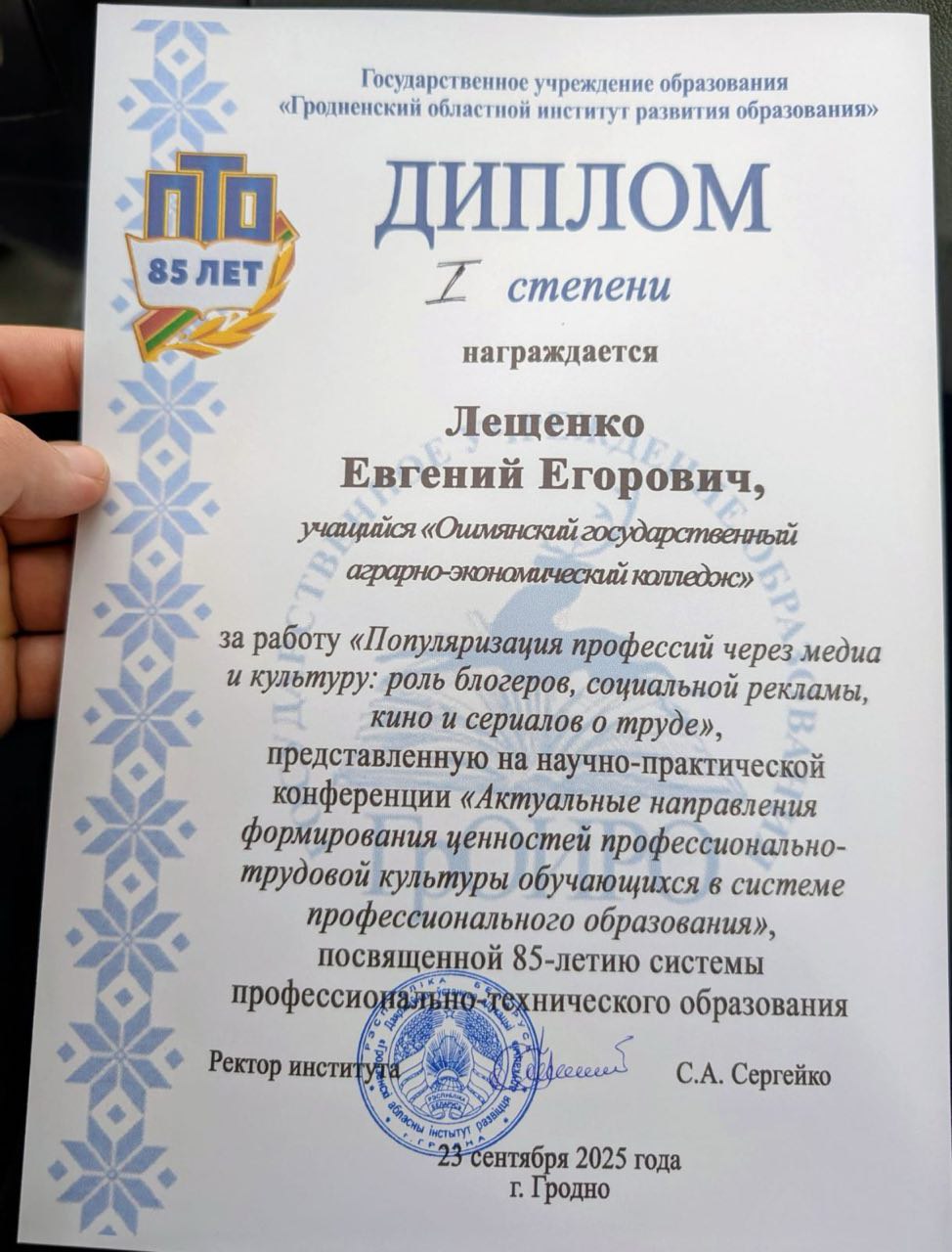 23 сентября 2025 года на базе Гродненского колледжа строительных технологий состоялась научно-практическая конференция «Актуальные направления формирования ценностей профессионально-трудовой культуры обучающихся в системе профессионального образования», организованная совместно с Гродненским областным институтом развития образования. В конференции принял учащийся колледжа Лещенко Евгений с докладом «Роль блогера в популяризации рабочей профессии» и был награжден дипломом 1 степени. Поздравляем Евгения, его руководителя Жуковскую Валентину Гедеоновну и желаем дальнейших успехов!